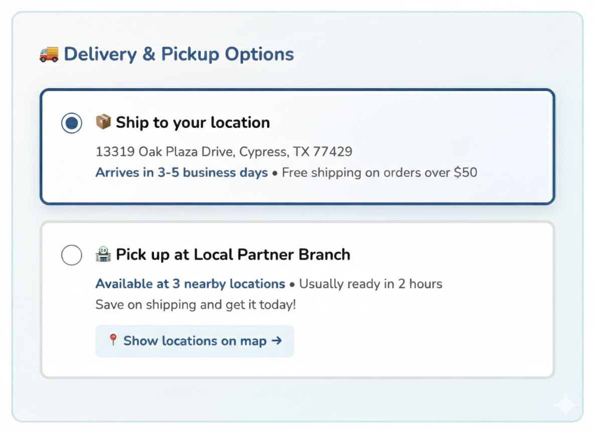 When you need it fast. When available, choose to pick up the product you ordered online at one of our local brick and mortar partner locations.